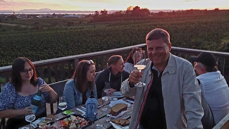 Der Spaziergang endete bei einer gemütlichen Heurigenjause, wo wir den Tag bei herzhaften Schmankerln und einem traumhaften Sonnenuntergang inmitten der Reben ausklingen ließen. Ein Abend, der das burgenländische Lebensgefühl perfekt widerspiegelt.